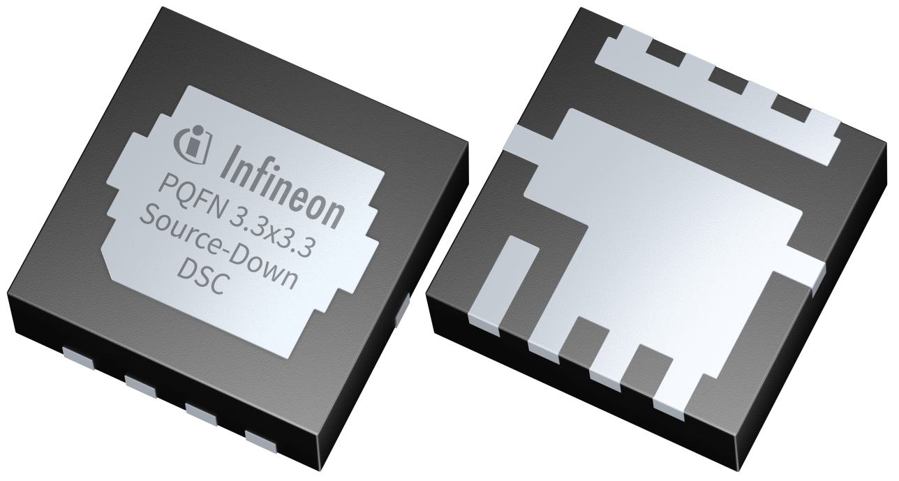 Infineon is presenting the new product of the portfolio extension for the innovative Source-Down technology: the OptiMOSTM 5 25 V PQFN 3.3x3.3 Source-Down DSC: IQE006NE2LM5SC. The revolutionary Source-Down technology introduces a flipped silicon die, which is positioned upside down inside of the components. This adjustment allows the source potential (instead of the drain potential) to be connected to the PCB over the thermal pad. Therefore, it offers several advantages, such as increased thermal capability, advanced power density or improved layout possibilities.Furthermore, the higher efficiency, the reduced active cooling requirements and the effective layout for thermal management are benefits at the system level. Thanks to the new benchmark RDS(on) and the innovative layout capacities enable the Source-Down concept to have a leading position in temperature management.Moreover, with the dual-side cooling package three times more power can be dissipated compared to the overmolded package. The Source-Down portfolio is addressing applications, such as drives, telecom, SMPS or server. The new technology can be found in two different footprints for now: Source-Down Standard-Gate and Source-Down Center-Gate (optimized for parallelization).